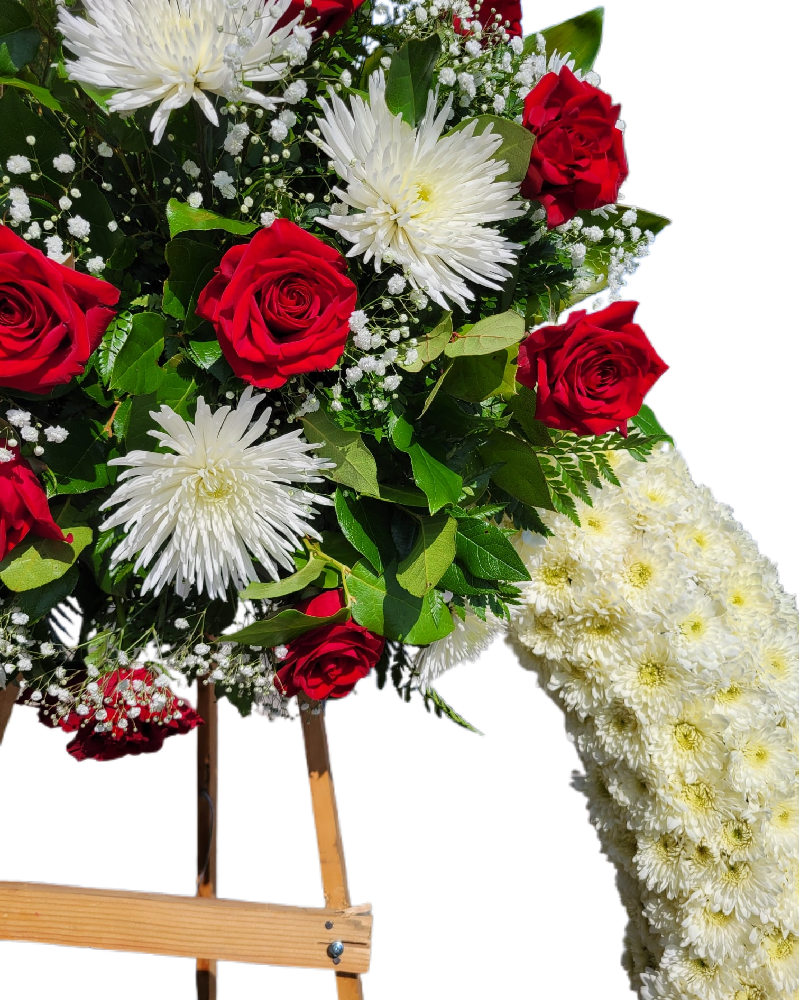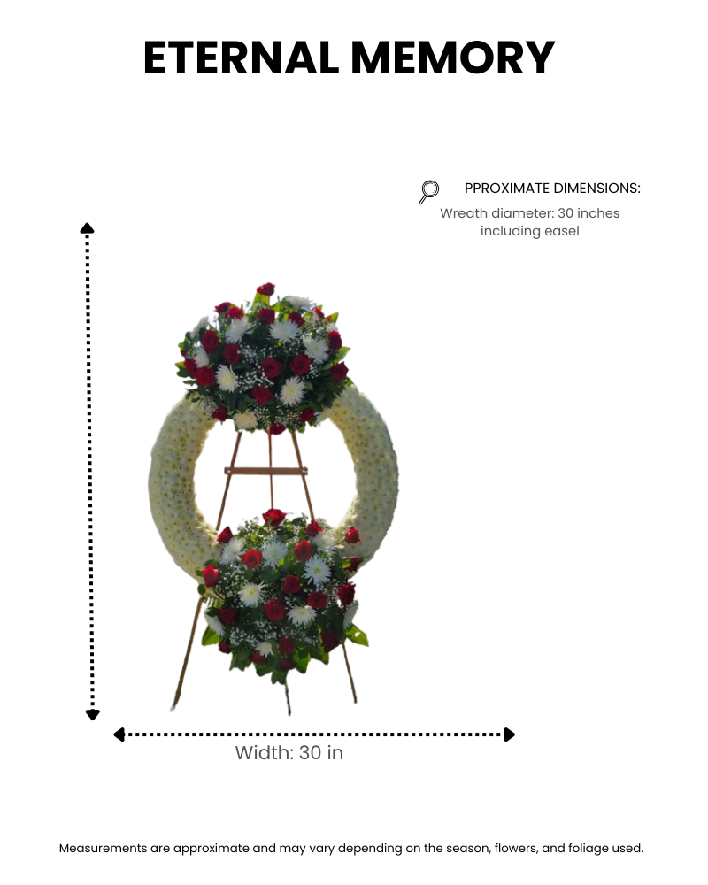 Eternal Memory is an elegant and timeless standing funeral wreath, thoughtfully designed to honor the life and memory of a loved one. This classic arrangement features a full circular wreath crafted with white chrysanthemums, symbolizing peace, purity, and eternal rest. Accents of deep red roses represent love, respect, and remembrance, while delicate white spider mums, baby’s breath, and fresh greenery add texture and harmony.