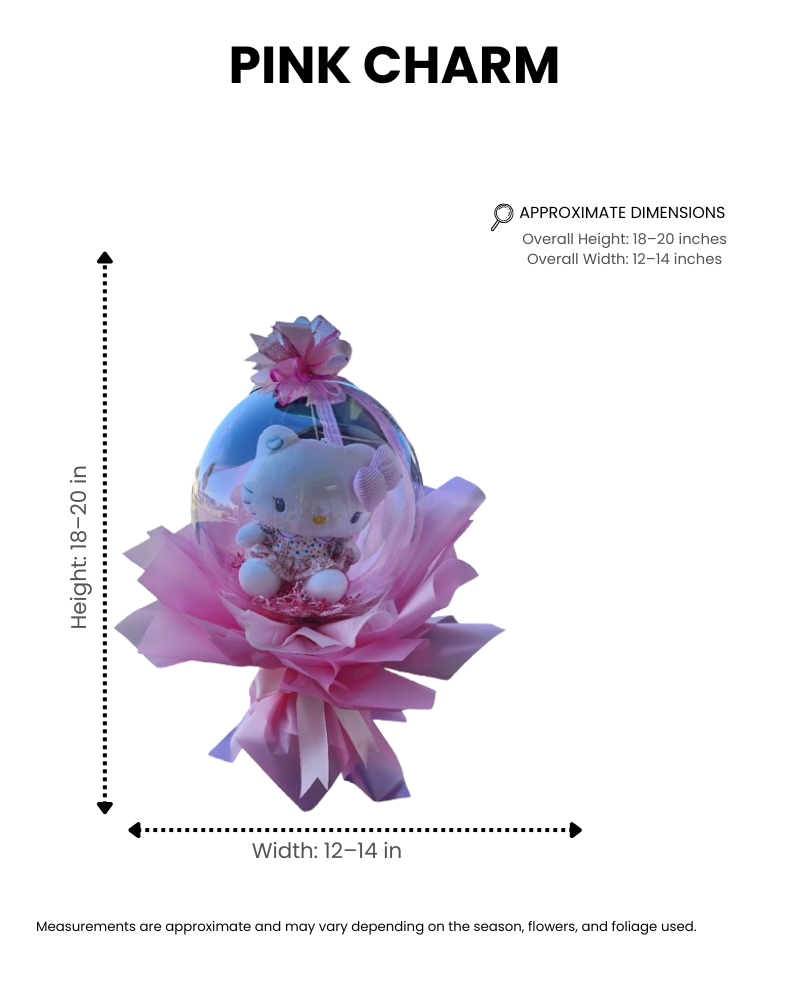 Pink Charm is a sweet and charming gift bouquet designed to surprise with softness and cuteness. This unique presentation features a Hello Kitty plush displayed inside a clear decorative balloon, beautifully wrapped in layered pink paper and finished with a matching ribbon.