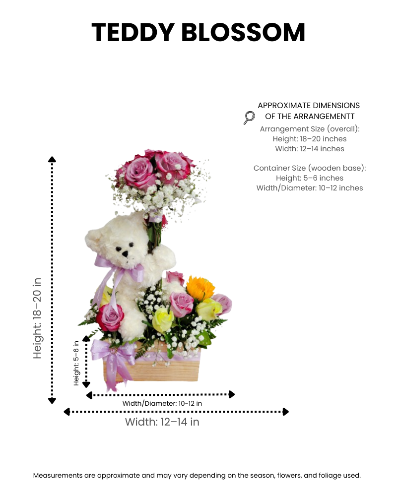 The Teddy Blossom Floral Arrangement with Teddy Bear is a sweet and charming floral design created to express affection and tenderness. This arrangement features pink and yellow roses beautifully combined with delicate white baby’s breath and fresh green foliage. A plush white teddy bear adds a heartwarming and playful touch, making this arrangement especially meaningful. Designed in a natural wooden base and accented with soft decorative bows, this piece offers a balanced and elegant presentation full of warmth and charm.